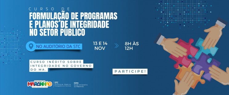 A Secretaria de Estado de Transparência e Controle (STC), por meio da Corregedoria Geral do Estado (Coge), abre inscrições para o primeiro curso específico sobre Integridade do Poder Executivo Estadual do Maranhão. O “Curso de Formulação de Programas e Planos de Integridade no Setor Público” será ministrado nos dias 13 e 14 de novembro, das 8h às 12h, no auditório da STC, em parceria com a Escola de Governo do Estado do Maranhão (EGMA).